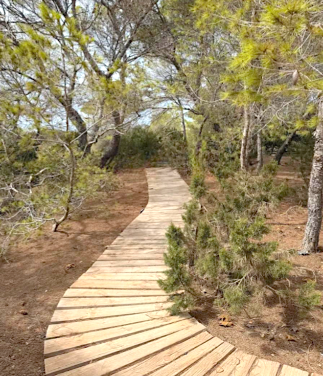 A 100-meter wooden walkway connecting the main parking area to the house