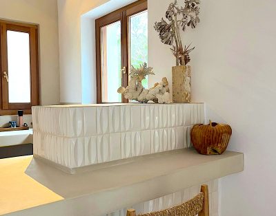 Al piano terra si trovano un ampio soggiorno-pranzo con camino e una cucina su livelli diversi, che condividono lo stesso spazio da cui si vede il mare, oltre a una camera matrimoniale e un bagno. Il piano superiore è composto da un grazioso disimpegno che funge da ufficio/zona chillout e che comunica con due camere da letto doppie con bagno privato e rispettive terrazze sopraelevate con vista sul mare.
