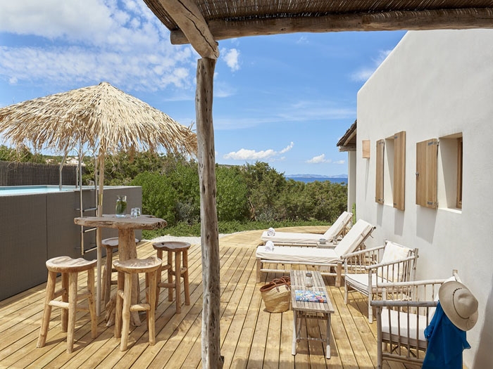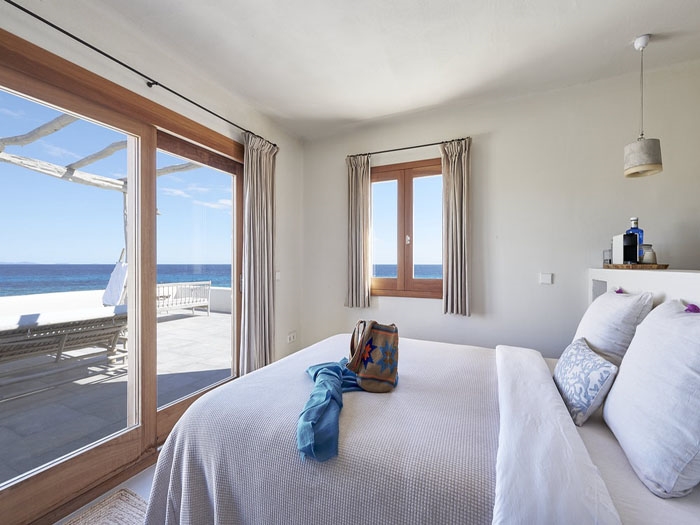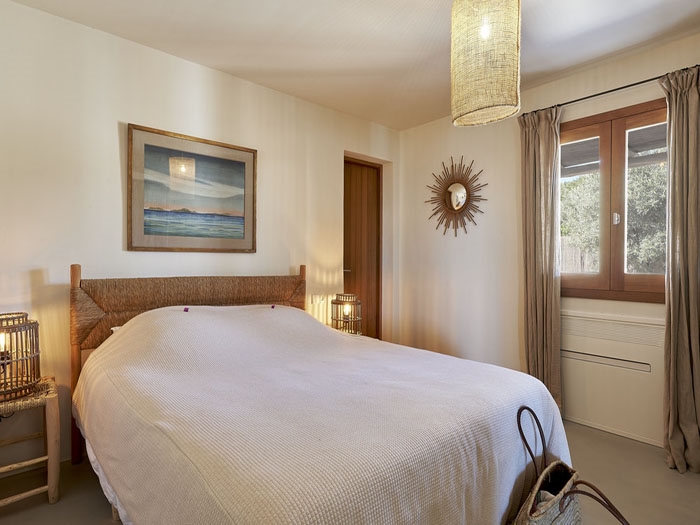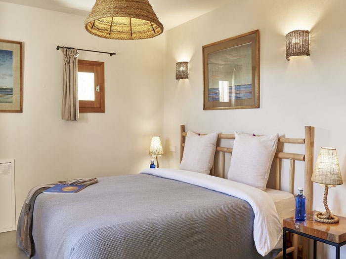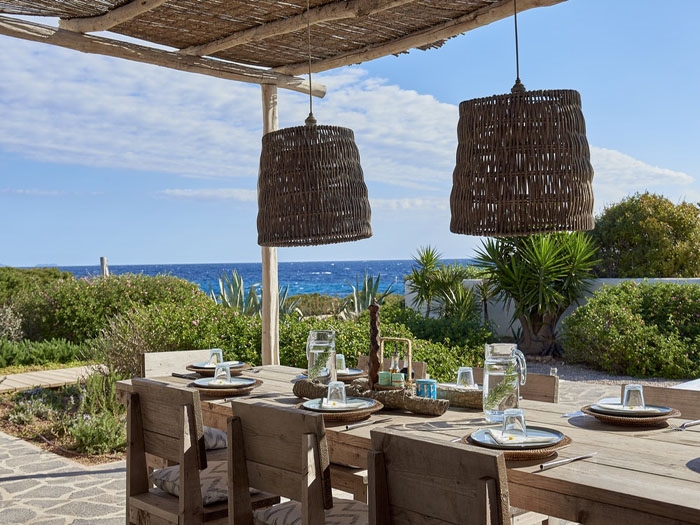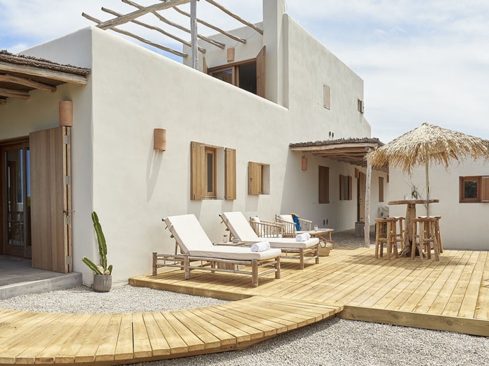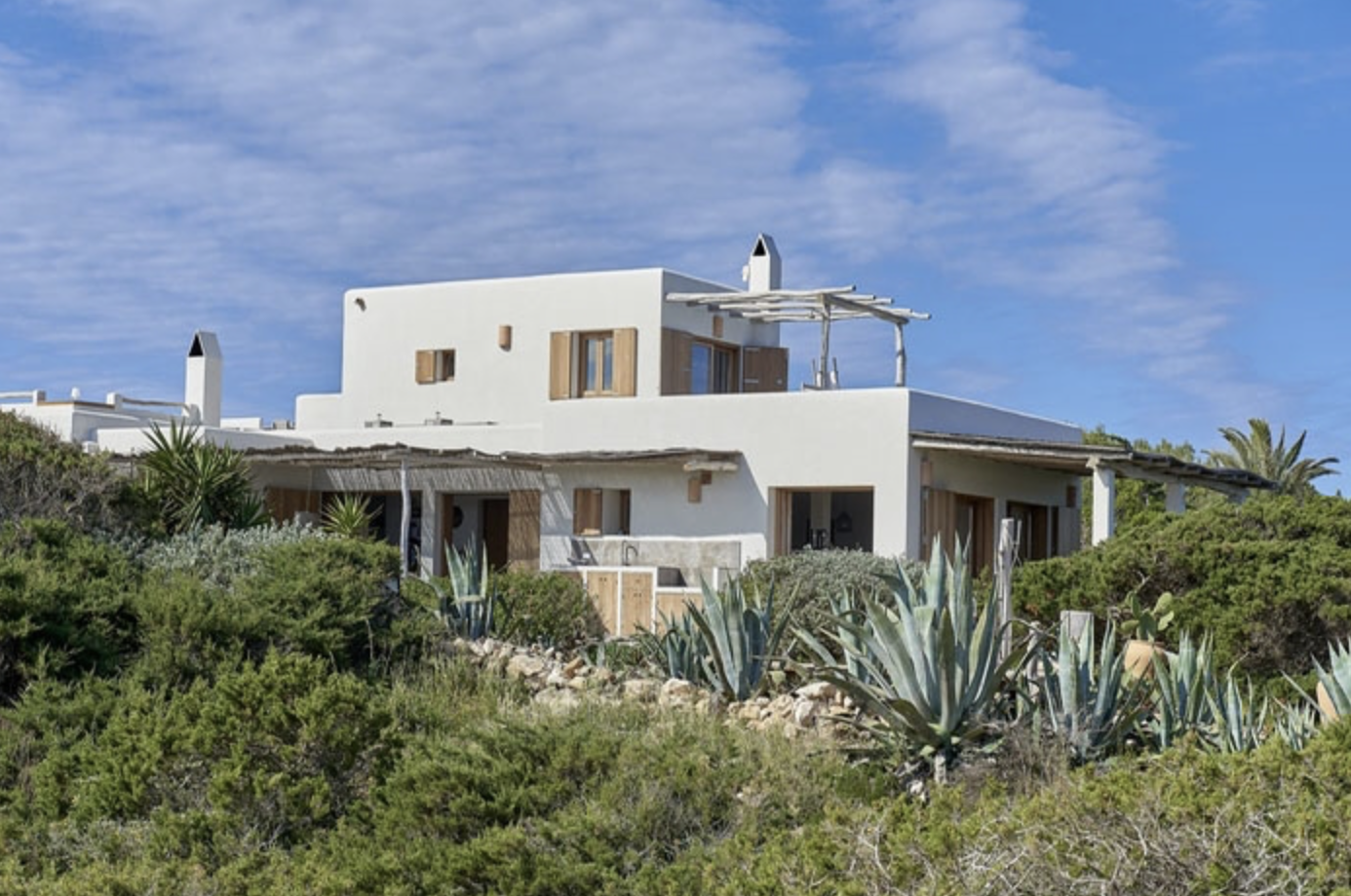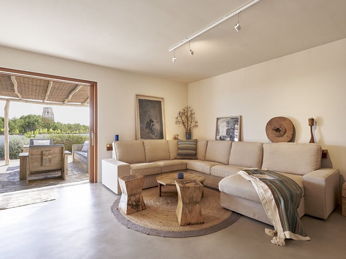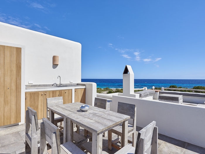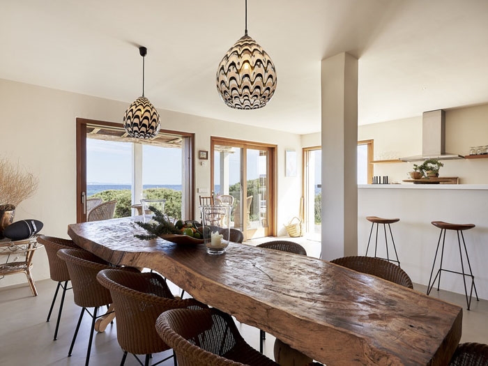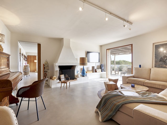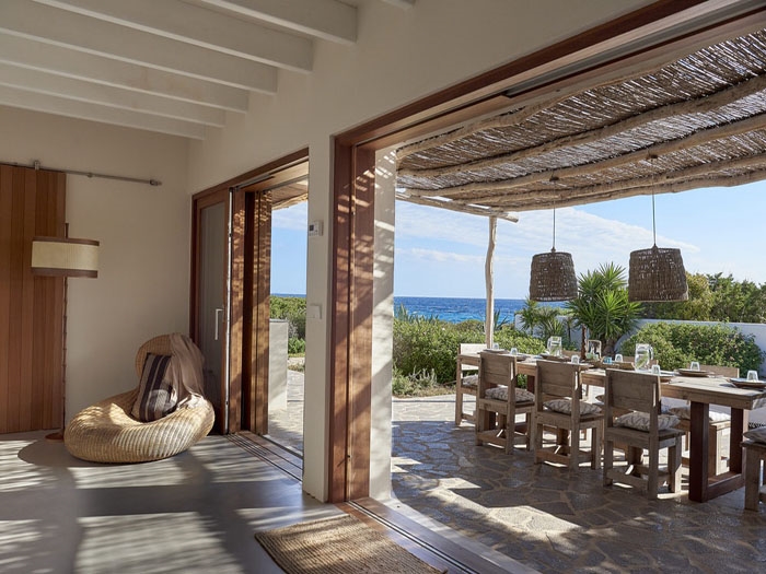 Ogni scelta di materiali e design è stata guidata dalla ricerca dell’autenticità. Le terrazze sono ombreggiate da tetti realizzati con antichi legni di ginepro, mentre il giardino si estende sotto ulivi secolari, arricchito da cactus e arbusti autoctoni. Gli interni, completamente rinnovati, riflettono il vero spirito di Formentera, unendo eleganza e comfort.