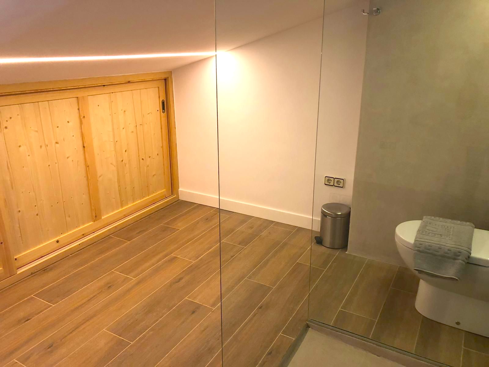 Una escalera interior conduce a la planta superior, donde un segundo dormitorio doble, elegante y con baño en suite, ofrece mayor privacidad y confort, siendo perfecto como dormitorio principal. El apartamento dispone de aire acondicionado en todas sus estancias, garantizando confort durante todo el año.
