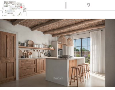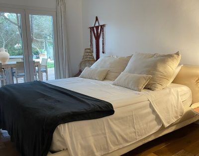 En el interior, la casa revela volúmenes generosos y una distribución cuidada. Ofrece cinco amplios dormitorios dobles, todos ellos luminosos y llenos de encanto isleño. El punto culminante es una suite en la planta superior, equipada con su propia cocina privada, baño y una encantadora terraza cubierta que enmarca el paisaje circundante: un refugio íntimo, ideal para relajarse al atardecer o disfrutar de un desayuno en total privacidad. En total, la vivienda dispone de tres baños modernos, algunos con elegantes lavabos dobles, asegurando el máximo confort para familias o grupos de invitados.